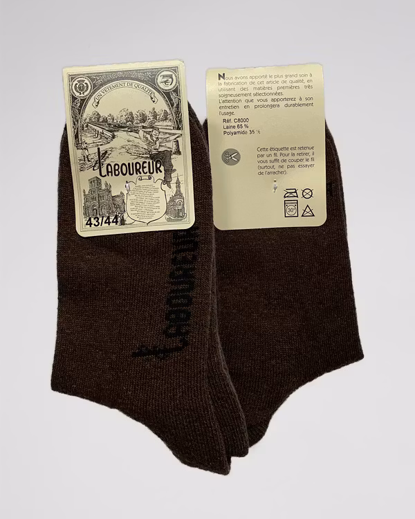 Värmande socka i ull. Stickad logo under foten och på skaftet, "Le Laboureur".